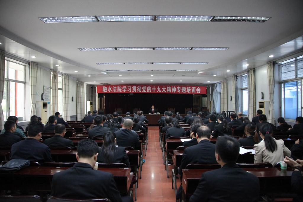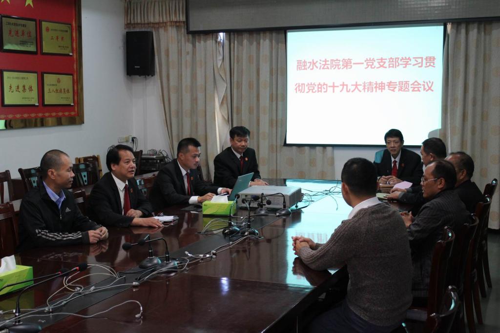 11月6日,融水法院通过全体集中学习、党组中心组专题学习、各支部重点学习等形式,深入学习贯彻党的十九大精神。 上午九点,融水法院开展学习贯彻党的十九大精神专题培训。该院党组书记、院长关宇向全体干警深入解读了习近平总书记代表第十八届中央委员会向大会作的题为《决胜全面建成小康社会 夺取新时代中国特色社会主义伟大胜利》的报告,传达了全市法院深入学习贯彻党的十九大精神专题培训会上文院长对下一步工作的几点部署,并结合该院审判工作实况对全体干警提出几点要求。